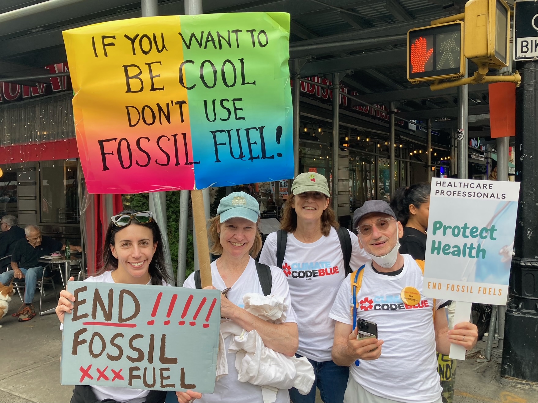 A group of physicians from Climate Code Blue at the New York City climate march, including, from left, Dr. Amanda Dilger of Massachusetts General Hospital, Dr. Brita Lundberg, Dr. Caren Solomon of Brigham and Women's Hospital, and Dr. Jim Recht of Cambridge Health Alliance.